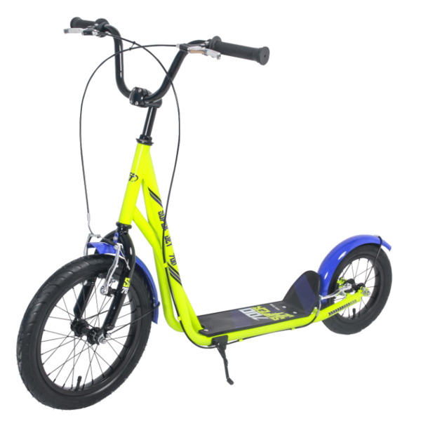 Внедорожник оборудован ручной тормозной системой V-brake, которая требует минимальных усилий с Вашей стороны для того, чтобы остановить самокат.Мягкие анатомические грипсы, выполненные из качественной резины, предотвращают скольжение рук, легко снимаются и моются.Плавное перемещение благодаря надувным колесам 16/12 дюймов.Обода, изготовленные из алюминия, способны выдерживать нагрузку до 100 кг