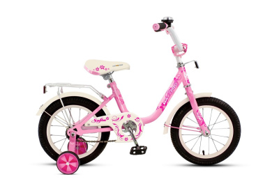 Рама: стальная, 14" размер колеса, технологичная двуслойная покраска, задний ножной тормоз, ручной ободной тормоз, крашенный обод, крылья. Багажник, звонок, стальная защита цепи, боковые колеса.
