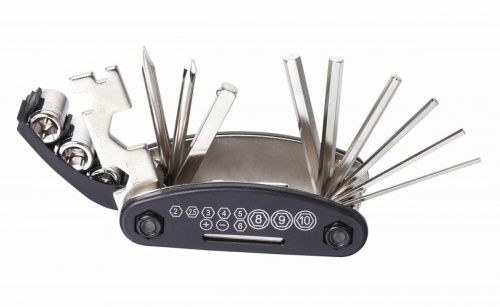 Складной набор инструментов 15 функций, размер шестигранных ключей: 2/2,5/3/4/5/6 мм, отвертка: +/-,  спицевой ключ 14G, семейный ключ 8/10/15мм, торцевые головки 8/9/10 мм, цвет черный. (11206649/130418/0009906, Китай)