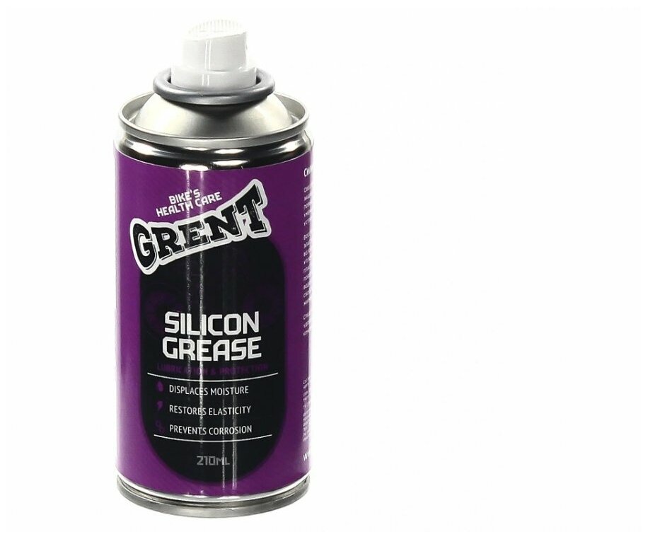 Силиконовая смазка GRENT Silicon Grease 210 мл - средство для эффективного ухода за подвижными частями велосипеда. Устойчива к влаге, защищает от коррозии. Восстанавливает и защищает эластичность резиновых уплотнителей и пластиковых деталей. Формует устойчивую защитную пленку и придает блеск.