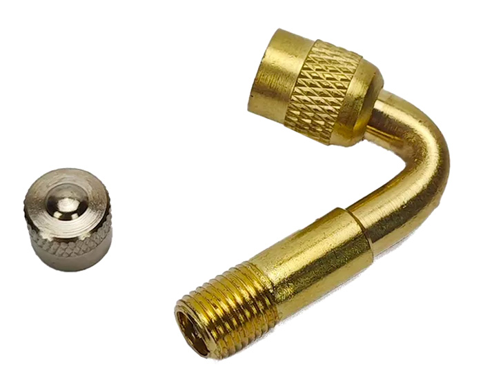 Угловой удлинитель для золотника на 45° упрощает процесс накачивания колес, в том числе при размещении вентилей в труднодоступных местах. С его помощью удобнее выполнять подкачку и проверку давления на дисках разного типа. Деталь выполнена из латуни и фиксируется на золотнике посредством резьбового соединения.