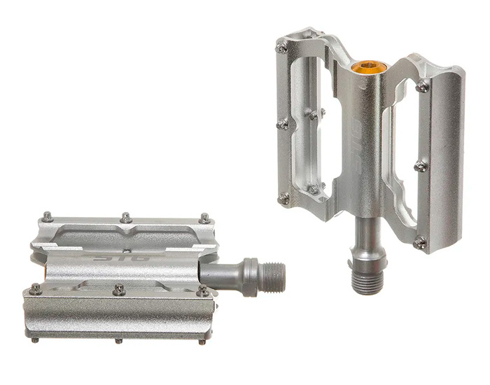 Педали STG BC-PD213 алюминиевые, на промышленных подшипниках, серебристые. Их конструкция выполнена из алюминиевого сплава и собрана на качественных промподшипниках, толщина корпуса по всей длине педали 18мм, ось 9/16". В каждую педаль вмонтированы 12 металлических шипов, которые обеспечивают максимальное сцепление с ботинком. Цвет серебристый. Из-за особой конструкции, педали обеспечивают надежное сцепление с обувной подошвой, предотвращают ее соскальзывание на цепь, крылья и пол.